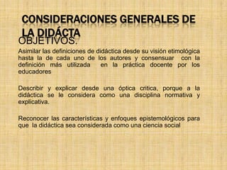 Este documento presenta una introducción a la didáctica desde tres perspectivas. Explica la etimología de la palabra didáctica, describiéndola como el arte de enseñar. Luego define la didáctica como una ciencia y un arte, investigando métodos de aprendizaje y estableciendo normas basadas en evidencia. Finalmente, resume las definiciones de varios autores y divide la didáctica en dos campos: la matética, que se enfoca en el estudiante, y la sistemática, que se enfoca en el proceso