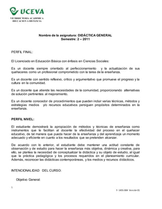 Este documento presenta la asignatura de Didáctica General de tercer semestre de la Licenciatura en Educación Básica con énfasis en Ciencias Sociales. Incluye el perfil del licenciado, los objetivos del curso, las unidades temáticas, actividades y productos esperados. Las unidades abordan temas como la didáctica y su objeto de estudio, la práctica pedagógica, métodos y técnicas de enseñanza, y medios y recursos didácticos. El documento proporciona los fundamentos teóricos