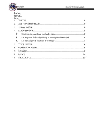 El documento describe el papel del profesor en la enseñanza de estrategias de aprendizaje. Explica que el profesor debe enseñar a los estudiantes a reflexionar sobre su propio aprendizaje, conocer sus fortalezas y debilidades, y aplicar métodos científicos como formular hipótesis. También debe diseñar programas que promuevan el uso de procedimientos estratégicos y utilizar métodos como la modelación, el apoyo guiado y la retroalimentación. Finalmente, concluye que el profesor debe