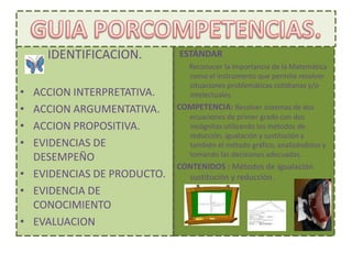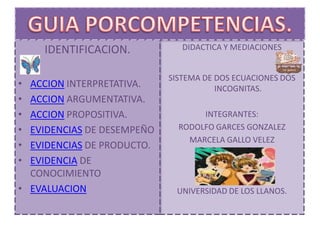Este documento presenta una guía didáctica sobre sistemas de dos ecuaciones con dos incógnitas. La guía incluye secciones sobre interpretación, argumentación y proposición de ejercicios, así como evidencias del desempeño, productos y conocimientos de los estudiantes. El objetivo es que los estudiantes mejoren su comprensión de este tema matemático a través de la realización de ejercicios y evaluar el aprendizaje logrado.