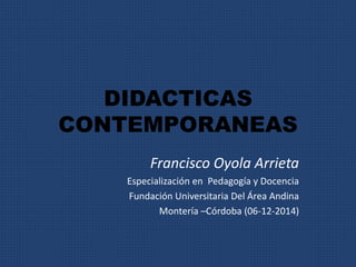 Las didácticas contemporáneas se basan en enfoques interactivos de enseñanza y aprendizaje. El profesor y los estudiantes juegan roles complementarios, donde el profesor no impone el conocimiento y los estudiantes no imponen sus propias ideas. Las didácticas contemporáneas se derivan de la psicología evolutiva y social y buscan desarrollar la comprensión a través de enfoques cognitivos, afectivos y basados en problemas. Se clasifican en funcionales, estructurales y cognitivo-af