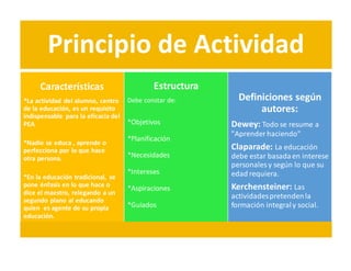 El principio de actividad establece que la participación activa del alumno es fundamental para su educación, ya que nadie aprende solo observando a otros sino haciendo cosas por sí mismo. Un programa educativo basado en este principio debe centrarse en los objetivos, intereses y aspiraciones del estudiante y guiar sus actividades. Autores como Dewey, Claparade y Kerchensteiner concuerdan en que la educación debe estar fundamentada en la acción y experiencia personal del alumno de acuerdo a su edad y formación integral.