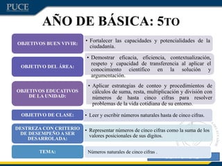 Este documento presenta una planificación didáctica para una clase sobre números naturales de cinco cifras en quinto grado de básica. La planificación incluye el objetivo de la clase, que es representar números de cinco cifras como la suma de los valores posicionales de sus dígitos. También describe las etapas de la clase, como asegurar los conocimientos previos, orientar hacia el objetivo, tratar el contenido, consolidar aprendizajes y evaluar resultados. El método es deductivo y se utilizarán estrategias como lluvia
