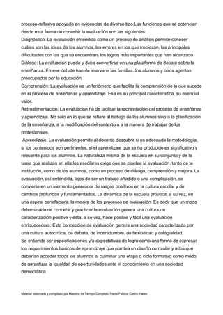 El documento habla sobre la evaluación en el marco de las competencias integrada a los procesos de enseñanza y aprendizaje. Explica que la evaluación debe ser un proceso de diagnóstico, diálogo y comprensión para mejorar la enseñanza y el aprendizaje, en lugar de ser solo un mecanismo de control. También describe el Inventario de Desarrollo Infantil, una herramienta que evalúa el desarrollo cognitivo, motor, socioemocional y las actitudes hacia el aprendizaje de los niños en ed