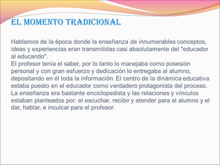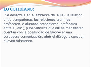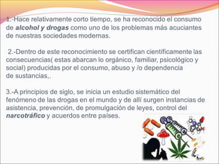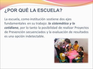 El documento discute diferentes enfoques para la prevención del consumo de drogas entre jóvenes. Inicialmente, se pensó que proveer información era suficiente, pero esto no fue efectivo. Ahora, se cree que es mejor un enfoque integral que involucre a las personas, mediadores sociales y contenidos que desarrollen habilidades. También se discuten conceptos como riesgo y las influencias ambientales, sociales y personales en el consumo, así como las ideas previas de jóvenes y adultos sobre el tema.