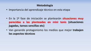 El documento aborda la metodología de enseñanza del tenis, enfatizando la importancia del aprendizaje técnico en las fases iniciales y el uso de situaciones de juego real. Se sugiere una estructura de entrenamiento que incluye calentamiento, práctica técnica, y aplicación en situaciones de juego, además de recomendaciones para la seguridad y organización. Se destaca la necesidad de adaptar las sesiones al nivel de los alumnos y mantener una alta actividad con cambios frecuentes de oponentes.