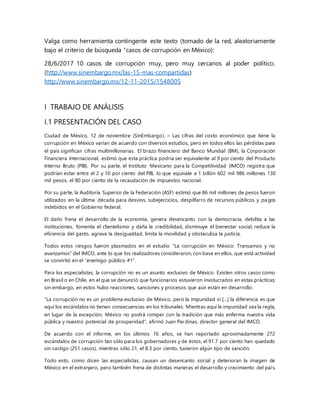 Este documento presenta un caso de estudio sobre la corrupción en México. Detalla 10 casos emblemáticos de corrupción involucrando al presidente, secretarios de estado, gobernadores y altos funcionarios. Incluye información sobre las estimaciones del costo económico de la corrupción para México y la falta de consecuencias por actos de corrupción. El documento provee antecedentes y detalles sobre varios escándalos de corrupción recientes.