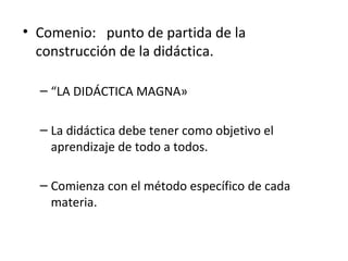 El documento trata sobre la didáctica y el currículum. Explica que la didáctica estudia el proceso de enseñanza-aprendizaje y que Comenio fue pionero en este campo. También distingue entre didáctica general, que estudia principios comunes, y didácticas específicas, que se enfocan en disciplinas particulares. Finalmente, define el currículum como el plan de estudios y examina diferentes perspectivas sobre su naturaleza y desarrollo.