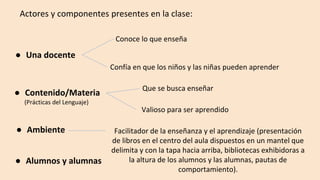 El documento describe los componentes y procesos involucrados en una clase de enseñanza de lenguaje. La maestra enseña a los estudiantes utilizando libros y actividades de lectura en grupo, individual y en parejas. Ella crea un ambiente de aprendizaje facilitador y guía a los estudiantes a través del proceso de enseñanza para desarrollar su comprensión y habilidades de lectura.