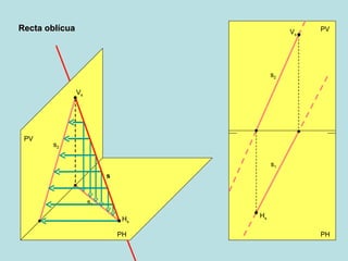 Este documento describe las diferentes posiciones que puede tomar una recta en un sistema diédrico. Explica que una recta puede ser oblícua, paralela al plano vertical, paralela al plano horizontal, paralela a ambos planos, perpendicular al plano horizontal, perpendicular al plano vertical, o perpendicular a la línea de tierra.