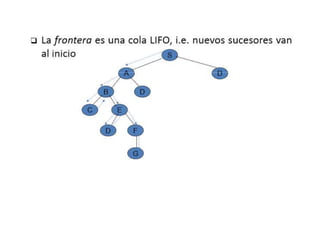 El documento resume diferentes tipos de búsqueda en inteligencia artificial, incluyendo búsqueda ciega, heurística y con adversarios. Describe estrategias como búsqueda en anchura, profundidad, bidireccional y con heurísticas como gradiente. Explica conceptos clave como función de evaluación heurística y cómo la búsqueda con adversarios analiza problemas con múltiples oponentes que modifican el estado del sistema.