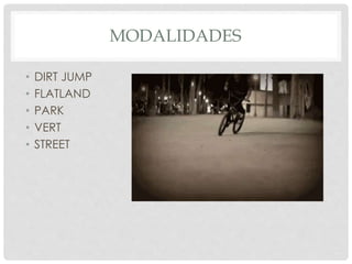 Este documento describe las cinco modalidades principales del BMX: dirt jump, flatland, park, vert y street. Dirt jump involucra saltos acrobáticos usando rampas de tierra, flatland se realiza en superficies planas, y park, vert y street usan rampas y obstáculos de cemento o madera para realizar acrobacias.