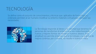 El documento define varios conceptos clave relacionados con la tecnología y la sociedad. Define la tecnología como el conjunto de conocimientos y técnicas que permiten satisfacer las necesidades humanas. Explica que una sociedad se refiere a un grupo que comparte una cultura, costumbres e ideologías. También describe un sistema económico como la estructura de producción y distribución de recursos para satisfacer necesidades básicas. Finalmente, distingue entre la industrialización y las tecnologías de la información y la comunicación como fuerzas