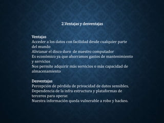La nube ofrece acceso a datos desde cualquier lugar, alivia el almacenamiento local y es económica. Sin embargo, también existe la percepción de pérdida de privacidad y dependencia de proveedores. Algunas plataformas populares para compartir archivos en la nube son Dropbox, Google Drive, SkyDrive, SugarSync y Amazon Cloud Drive.