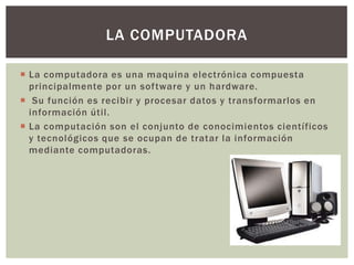 El documento describe las partes principales de una computadora, incluyendo el software y hardware, y explica algunos componentes clave como el sistema operativo, hojas de cálculo, procesadores de texto y lenguajes de programación. También menciona las referencias APA y las barras de una computadora Mac.