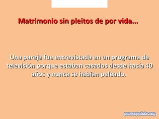 Un matrimonio fue entrevistado porque nunca se habían peleado a pesar de estar casados por 40 años. El marido explicó que su esposa había sido criada por un padre estricto y que ella tenía una yegua favorita. En su luna de miel, la yegua tropezó tres veces y la esposa le advirtió "uno, dos, tres" antes de matarla de un tiro para evitar más problemas. Desde entonces, el marido no se ha atrevido a discutir con su esposa.