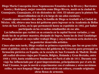 Diego Rivera fue un pintor mexicano nacido en 1886 en Guanajuato, México. Recibió formación artística en la Academia de San Carlos en la Ciudad de México y luego estudió en España y Europa, donde fue influenciado por el postimpresionismo y el cubismo. Se dedicó a expresar en sus obras los sucesos y esperanzas de la Revolución Mexicana a través de la técnica del fresco. A su regreso a México en 1921, fundó junto a otros artistas la escuela mexicana de pintura y creó importantes