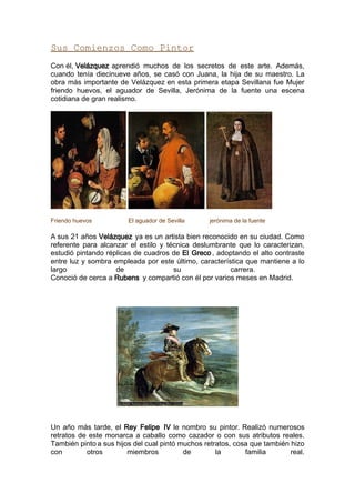Velázquez fue un pintor español del siglo XVII considerado uno de los más grandes genios de la pintura barroca. Nació en Sevilla y aprendió el oficio bajo la tutela de Francisco Pacheco, casándose con su hija. Más tarde se trasladó a Madrid donde fue nombrado pintor de la corte por Felipe IV, para quien pintó numerosos retratos reales. Algunas de sus obras maestras más famosas incluyen Las meninas, Las hilanderas y La rendición de Breda, caracterizadas por su