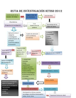 El documento describe los pasos del proceso de investigación ietisd 2012, el cual incluye la conformación de equipos de trabajo, la identificación de 40 problemas a través de una lluvia de ideas, la aplicación de 5 criterios para valorar los problemas, la selección de una pregunta reina, y el refinamiento de la pregunta de investigación. Luego, se detallan los pasos que incluyen el diseño de la investigación, la construcción de un artefacto, y la participación en ferias tecnológicas.