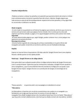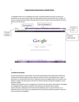 El documento describe las características y funciones de los navegadores Google Chrome y Mozilla Firefox. Chrome se enfoca en la simplicidad y velocidad, mientras que Firefox permite la sincronización entre dispositivos a través de su función Sync. Ambos navegadores ofrecen opciones para gestionar marcadores, descargas, configuración y privacidad.