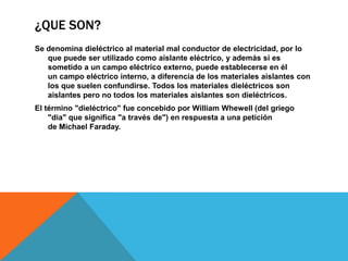 Este documento define los dieléctricos como materiales malos conductores de electricidad que pueden usarse como aislamiento eléctrico. Explica que los dieléctricos permiten la formación de un campo eléctrico interno cuando se someten a un campo eléctrico externo, a diferencia de los materiales aislantes. También describe la constante dieléctrica como una propiedad relacionada con la permitividad eléctrica de un medio dieléctrico y cómo afecta la velocidad de las ondas electromagné