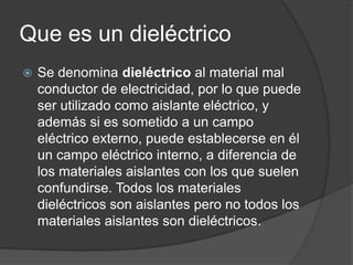 Este documento describe los diferentes tipos de materiales dieléctricos, incluyendo sólidos como vidrio, cerámica y plástico; líquidos como aceites; y gases como el aire y nitrógeno. Explica que los dieléctricos son materiales aislantes que permiten el establecimiento de un campo eléctrico interno cuando se someten a un campo externo. También describe cómo los diferentes materiales dieléctricos afectan la capacitancia de un capacitor.