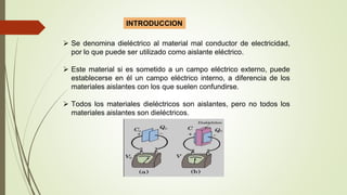 Este documento presenta la información de un grupo de física III en la universidad. El grupo está formado por 5 estudiantes y su profesor es el Msc. Optaciano Vásquez García. El documento introduce los conceptos de dieléctricos y aislantes eléctricos, explica sus diferencias y da ejemplos de cada tipo de material. También describe las aplicaciones y propiedades de los dieléctricos sólidos, líquidos y gaseosos.