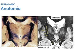 Este documento describe la anatomía y componentes del diencéfalo. El diencéfalo está compuesto principalmente por el tálamo, hipotálamo y algunas otras estructuras. El tálamo se divide en grupos nucleares, incluyendo el grupo nuclear lateral que contiene núcleos específicos y no específicos que se conectan a diferentes áreas de la corteza cerebral. El documento también describe las relaciones anatómicas y funciones generales de las principales estructuras del diencéfalo.