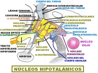El documento describe la anatomía del diencéfalo, incluyendo sus límites y partes principales como el tálamo, epitalamo y subtalamo. El tálamo se describe como la estructura gris más representativa del diencéfalo y centro sensitivo superior, con detalles sobre sus polos, caras y grupos nucleares laterales y dorsolaterales. El epitalamo incluye la glándula pineal y núcleos habenulo-interpedunculares. El subtalamo se ubica debajo del tálamo entre la cápsula