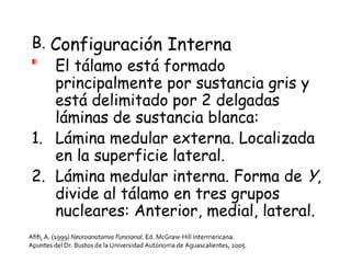El documento resume la neuroanatomía del diencéfalo, el sistema límbico, el tálamo y el hipotálamo. Describe las estructuras y funciones del diencéfalo, el sistema límbico, el tálamo y el hipotálamo, incluidos sus núcleos y conexiones. Explica que estas regiones del cerebro están involucradas en funciones como la memoria, las emociones, el aprendizaje y la regulación de procesos vitales.