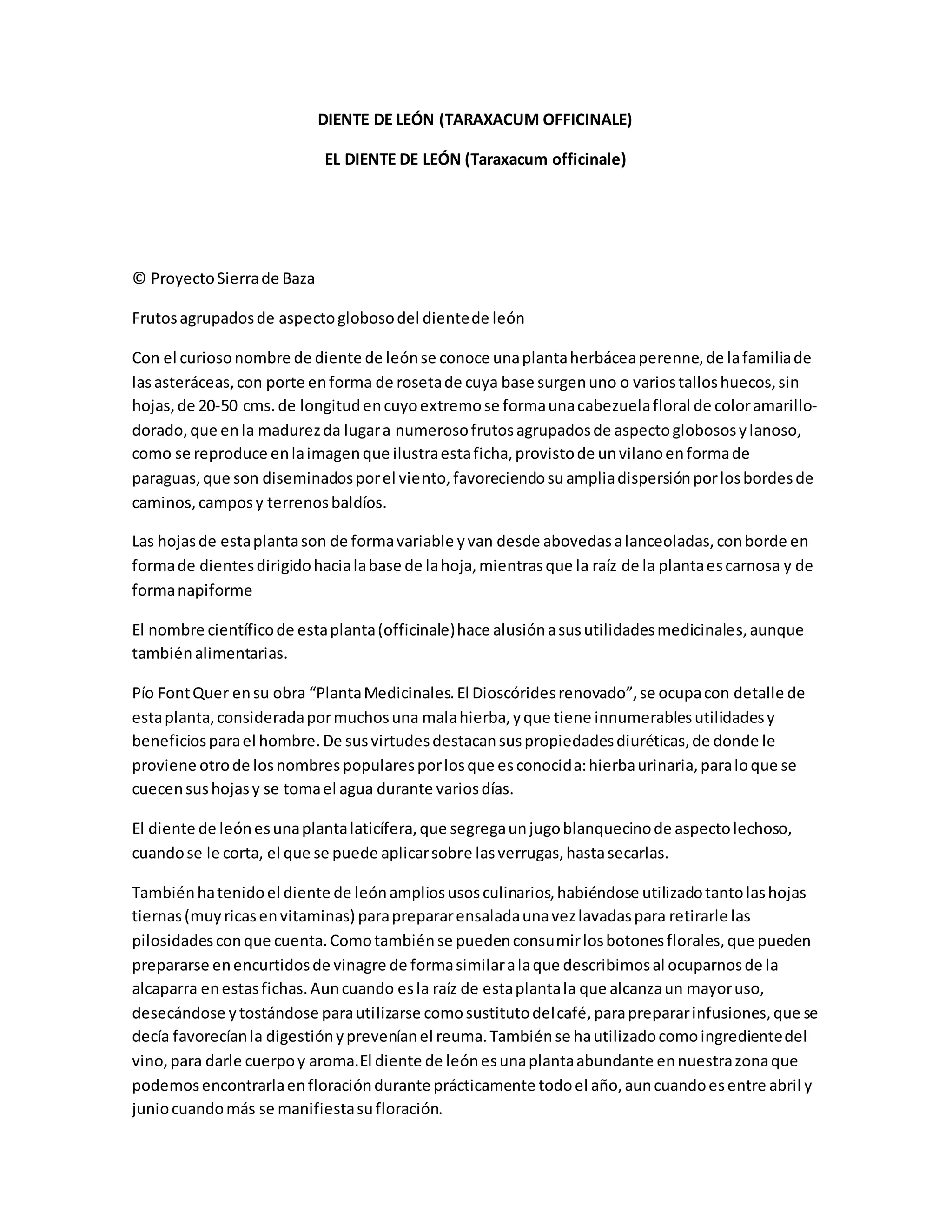 El diente de león es una planta herbácea perenne con hojas variables y flores amarillas. Crece en forma de roseta y sus frutos se dispersan por el viento. Tiene usos medicinales como diurético y para tratar verrugas, así como usos culinarios en ensaladas, encurtidos y como sustituto del café. Es una planta común que florece durante gran parte del año.