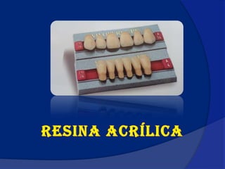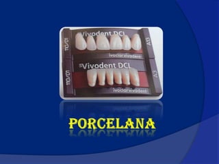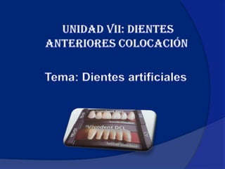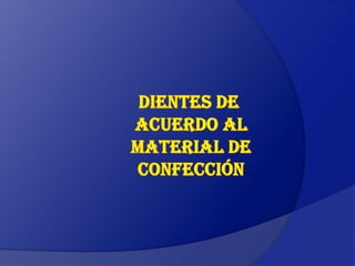 Los dientes artificiales, conocidos como prótesis dentales, se fabrican con porcelana o acrílico para reemplazar los dientes faltantes. Se distinguen por el material, la anatomía y la forma, y cumplen funciones estéticas y de masticación. Las prótesis de porcelana son muy duraderas pero difíciles de reparar, mientras que las de acrílico se pueden tallar y reparar fácilmente aunque se desgastan con mayor rapidez.