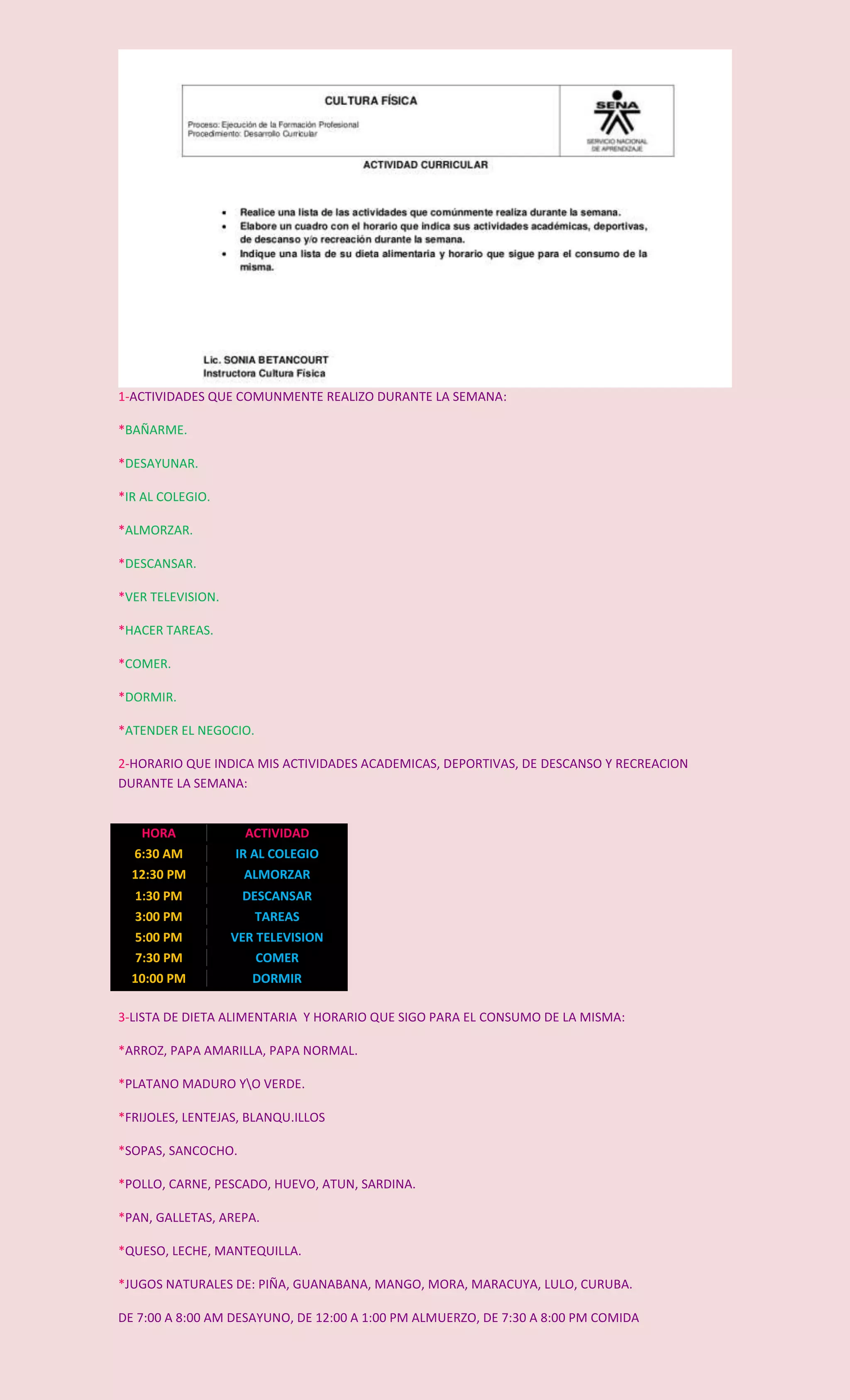 El documento describe la rutina semanal de una persona que incluye actividades como bañarse, desayunar, ir a la escuela, almorzar, descansar, ver televisión, hacer tareas, comer y dormir, así como un horario académico, deportivo y de ocio. También presenta una lista de alimentos consumidos y los horarios de comidas.