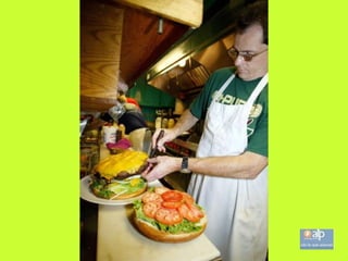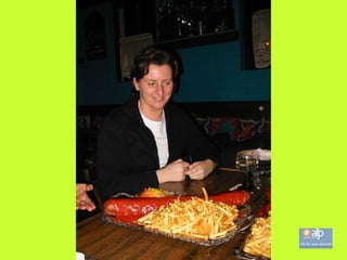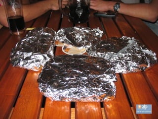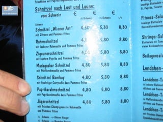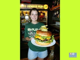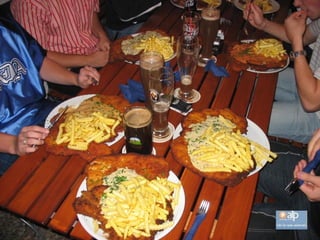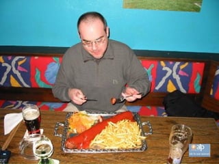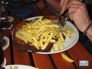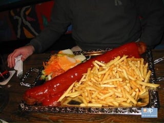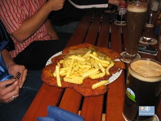 El documento describe un restaurante en Hofheim que sirve la milanesa más grande del mundo en un plato del tamaño de una pizza. Los precios son económicos y cada mesa tiene papel de aluminio para envolver la comida que no se pueda comer. Quienes necesitan usar el papel de aluminio son considerados cobardes. También ofrece otras opciones como salchichas y hamburguesas.