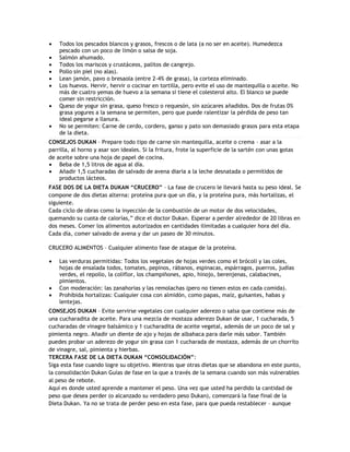 La dieta Dukan consta de 4 fases: 1) Ataque (proteínas puras), 2) Crucero (proteínas y verduras), 3) Consolidación (reintroducción gradual de otros alimentos), y 4) Estabilización (mantenimiento de por vida con 1 día de proteínas a la semana). La dieta se centra en el consumo de proteínas magras y verduras, y restringe los hidratos de carbono y grasas para promover una rápida pérdida de peso.