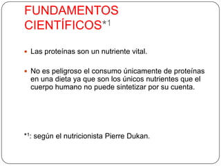 La dieta Dukan se basa principalmente en el consumo de proteínas puras, dividida en 4 fases: ataque, crucero, consolidación y estabilización. Si bien puede producir pérdida de peso rápida inicialmente, expertos desaconsejan esta dieta debido a que no hay evidencia científica que la respalde, puede provocar desequilibrios nutricionales y efectos adversos a largo plazo, y contradice las recomendaciones para una pérdida de peso saludable y sostenible.