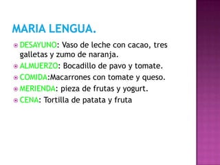 Este documento resume las dietas diarias, datos antropométricos, metabolismo basal y requerimientos calóricos de tres adolescentes mujeres de 14-15 años de edad. Proporciona detalles sobre sus desayunos, almuerzos, comidas, meriendas y cenas típicas, así como su peso, altura, edad y sexo. Además, incluye cifras sobre su metabolismo basal, gasto energético en reposo y necesidades calóricas diarias.