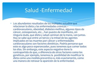 El documento describe cómo una dieta equilibrada y saludable está relacionada con la salud y la prevención de enfermedades. Explica que entre un tercio y la mitad de las muertes por cáncer y enfermedades cardiovasculares son atribuibles a factores dietéticos, pero que a diferencia de otros factores de riesgo, la dieta es algo que las personas pueden modificar para retrasar el desarrollo de enfermedades. También proporciona recomendaciones como incluir alimentos de todos los grupos, dividir las comidas