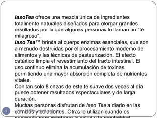 El documento promociona iaso tea y otros productos de Total Life Changes diseñados para la desintoxicación y pérdida de peso, subrayando sus ingredientes naturales y beneficios para la salud digestiva. También se menciona la dieta HCG que utiliza gotas homeopáticas para ayudar a movilizar grasa almacenada en el cuerpo, sugiriendo un plan de 26 días. Se enfatiza la importancia de seguir un régimen alimenticio bajo en calorías y se ofrece apoyo a través de un equipo para los dieters.