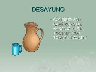 La dieta mediterránea se basa en una alimentación variada y equilibrada que incluye desayunos ligeros como café, zumo y tostadas con tomate y aceite, almuerzos como gazpacho y lentejas con verduras, pescado frito y cerveza para comer, sobremesa y siesta por la tarde, y cenas ligeras como tapas y cerveza.