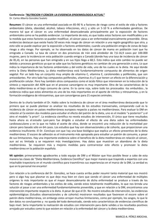 El documento presenta resúmenes de varias conferencias sobre la Dieta Mediterránea y su relación con la salud. Una conferencia discute cómo la Dieta Mediterránea reduce el riesgo de varias enfermedades crónicas y mejora el bienestar físico y mental. Otra conferencia describe un estudio que muestra que siguiendo la Dieta Mediterránea se reduce a la mitad el riesgo de diabetes. Finalmente, una conferencia discute cómo el ejercicio físico y mantener una buena forma física pueden retrasar el
