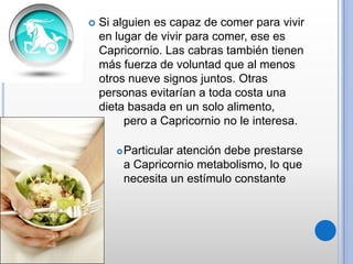Este documento presenta una dieta recomendada para las personas del signo zodiacal Capricornio. Señala que Capricornio tiene una fuerte voluntad y puede comer para vivir en lugar de vivir para comer. Recomienda alimentos ligeros como carne magra, pasta, cereales integrales, yogur, frutas y verduras. Además, proporciona un menú de ejemplo para la dieta de Capricornio de lunes a viernes y los fines de semana. Finalmente, menciona opciones de dietas bajas en cal