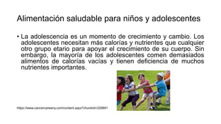Los adolescentes requieren una dieta equilibrada rica en calorías, nutrientes y fibra para apoyar su crecimiento y desarrollo. Deben consumir carbohidratos (45-65% de calorías), proteínas (15-25%) y grasas saludables (25-35%), evitando los alimentos con calorías vacías. Es esencial que los adolescentes incluyan una variedad de alimentos saludables y limites aquellos altos en azúcares y grasas saturadas para mantener un peso adecuado y una buena salud.