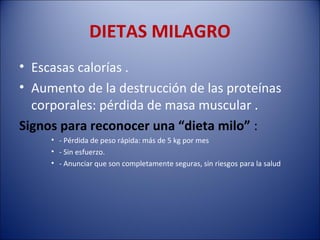 Las dietas milagro suelen ser dietas hipocalóricas desequilibradas que causan déficit de nutrientes, pérdida de masa muscular, efectos psicológicos negativos y el riesgo de trastornos alimenticios. Estas dietas prometen una pérdida de peso rápida pero no sostenible que generalmente conduce a un aumento de peso posterior.