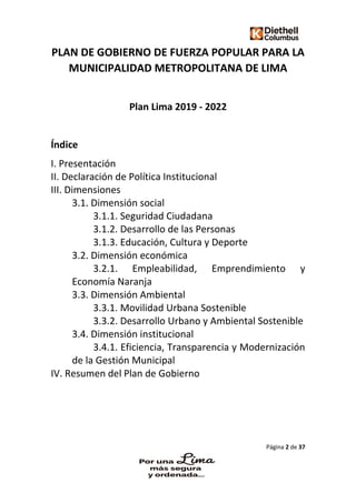 El documento presenta el Plan de Gobierno de Fuerza Popular para la Municipalidad Metropolitana de Lima para el periodo 2019-2022. El plan se organiza en torno a 4 dimensiones (social, económica, ambiental e institucional) y propone intervenciones prioritarias en 7 áreas estratégicas como seguridad ciudadana, desarrollo de las personas, educación y cultura, empleabilidad, movilidad urbana sostenible, desarrollo urbano ambiental y eficiencia institucional. El objetivo general es lograr que L