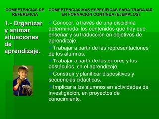 Este documento describe las competencias generales y específicas para trabajar en formación continua. Presenta 10 competencias generales y ejemplos más específicos de habilidades para cada una. La primera competencia general es organizar y animar situaciones de aprendizaje, con ejemplos como conocer los contenidos y objetivos de aprendizaje, trabajar a partir de las representaciones de los estudiantes, y construir planes y secuencias didácticas.