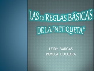 Este documento presenta una serie de reglas y consejos para comportarse adecuadamente en línea, conocido como "Netiqueta". Algunas de las reglas principales incluyen tratar a los demás como te gustaría ser tratado, observar antes de participar en nuevos espacios en línea, compartir conocimiento de forma respetuosa y respetar la privacidad de los demás. El documento enfatiza la importancia de ser amable, educado y respetuoso cuando se interactúa con otros en el ciberespacio.