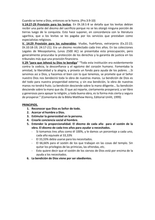 Este documento resume las enseñanzas bíblicas sobre el diezmo en el Antiguo Testamento. Explica que el diezmo era una ofrenda obligatoria del 10% de las cosechas y ganancias que se entregaba al sacerdocio para su sustento. También señala que cada tres años se recolectaba un diezmo adicional para ayudar a viudas, huérfanos y extranjeros. El propósito del diezmo era reconocer a Dios como dueño de todo y acercar al pueblo a él a través
