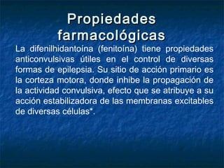 La difenilhidantoína es un antiepiléptico cuyo mecanismo de acción principal es estabilizar las membranas de las neuronas, reduciendo el paso de iones de sodio y calcio. Se usa para tratar diversos tipos de epilepsia y arritmias cardíacas asociadas a intoxicación digital. Los efectos secundarios más comunes incluyen nistagmo, vértigo y problemas gastrointestinales.