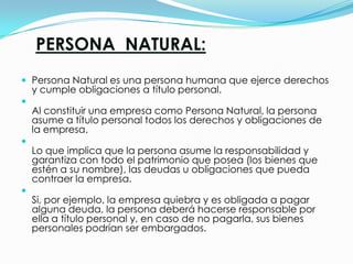 El documento resume las diferencias entre una persona natural y una persona jurídica al constituir una empresa. Una persona natural asume personalmente las deudas de la empresa, mientras que una persona jurídica limita la responsabilidad a los bienes de la empresa. Constituir una empresa como persona natural es más sencillo pero también implica más riesgos personales.